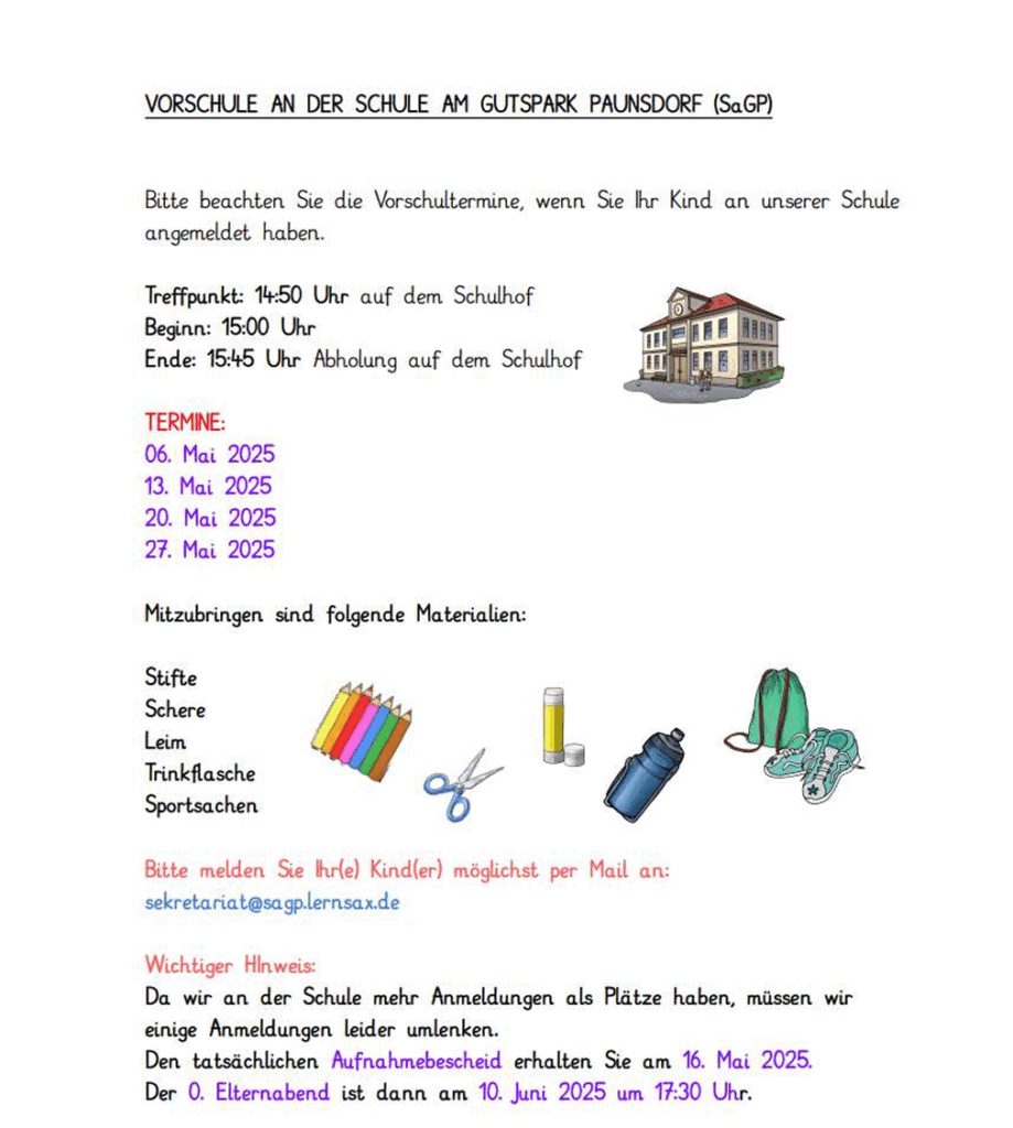 Die Vorschule findet jeweils von 15:00 Uhr bis 15:45 Uhr statt, bitte melden Sie Ihre Kinder vorab bei uns an. Die Emailadresse für die Anmeldung lautet sekretariat@sagp.lernsax.de. Vielen Dank!